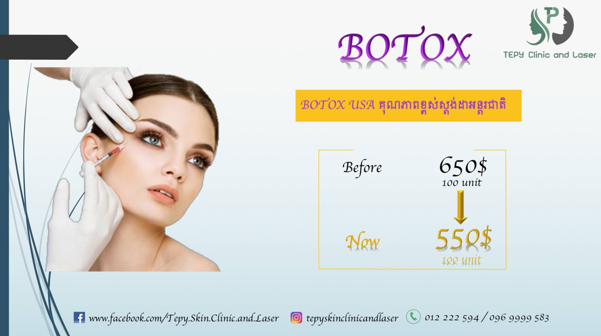 1. Botox បំបាត់ភាពជ្រាវជ្រួញ បង្រួមថ្គាម បំបាត់ញើស និងក្លិនក្លៀក បង្រួមកំភួនជើងធ្វើអោយជើងតូចស្រលូន បន្តឹងស្បែកមុខ និងបង្រួមរន្ធញើសលើផ្ទៃមុខ